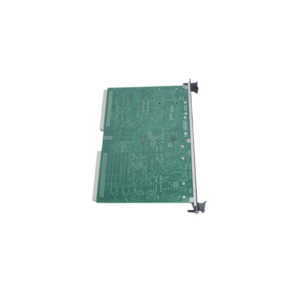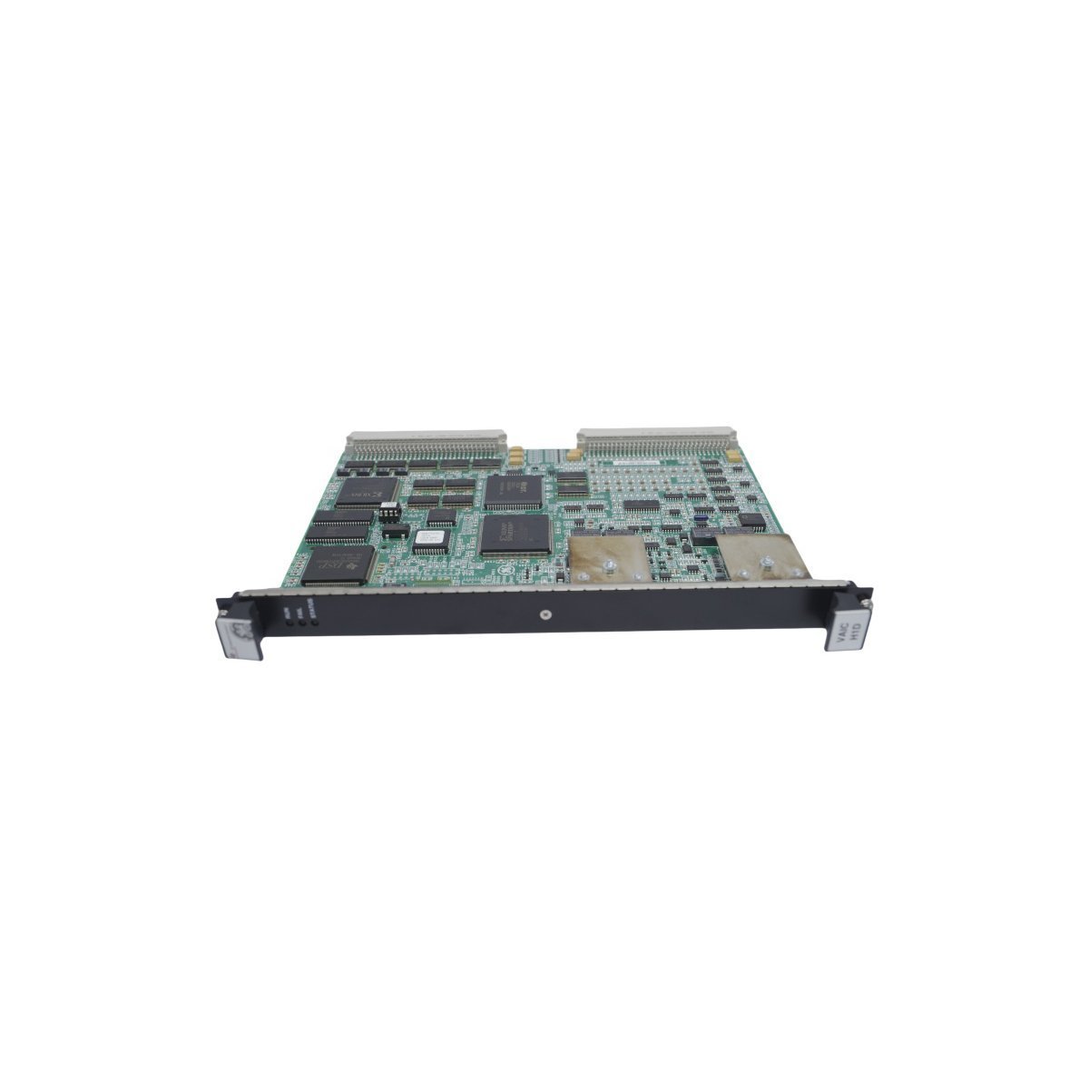 The front panel includes a narrow faceplate equipped with three diagnostic LEDs. These indicators provide real-time visual feedback regarding the operational health of the board. On the reverse side, two 37-pin connectors link the processor to the VME rack backplane. This connection facilitates rapid data exchange with other system components and controllers. The assembly consists of high-grade integrated circuits, relays, and diodes to ensure long-term durability. Each component features distinct part markings for simplified maintenance and identification.